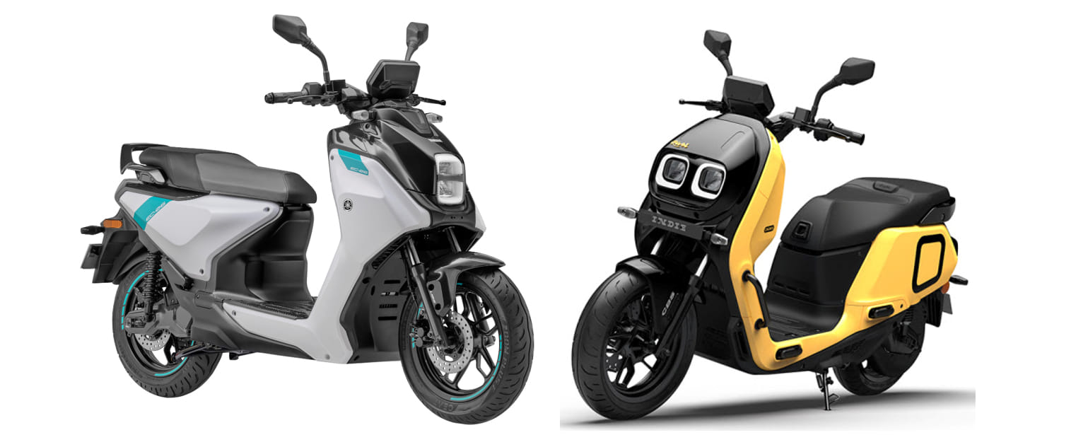 River Indie-based Yamaha EC-06 (left), revealed at EICMA 2025, first product to emerge from the collaboration between Yamaha and River Mobility, which will manufacture the model at its Hoskote plant.