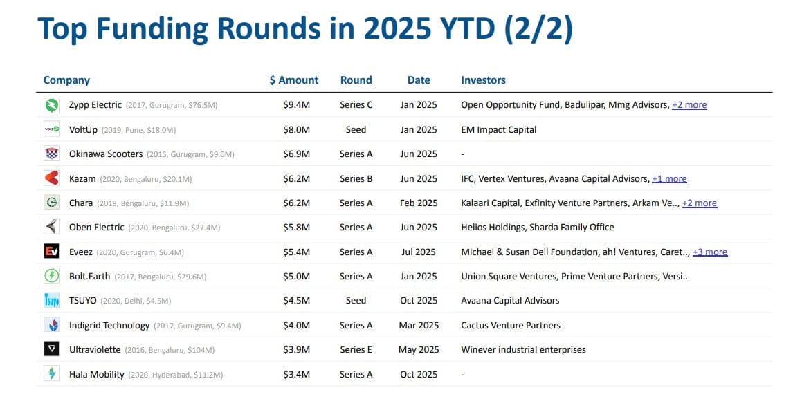 “The strong surge in late-stage capital, driven by a billion-dollar round supporting manufacturing and charging infrastructure, signifies India’s EV ecosystem has moved beyond early experimentation to embrace a phase of measurable, scaled maturity. It’s a clear signal that global and domestic investors now see EVs not just as a climate bet, but as a commercially viable, long-horizon opportunity,” said Neha Singh, co-founder of Tracxn.
