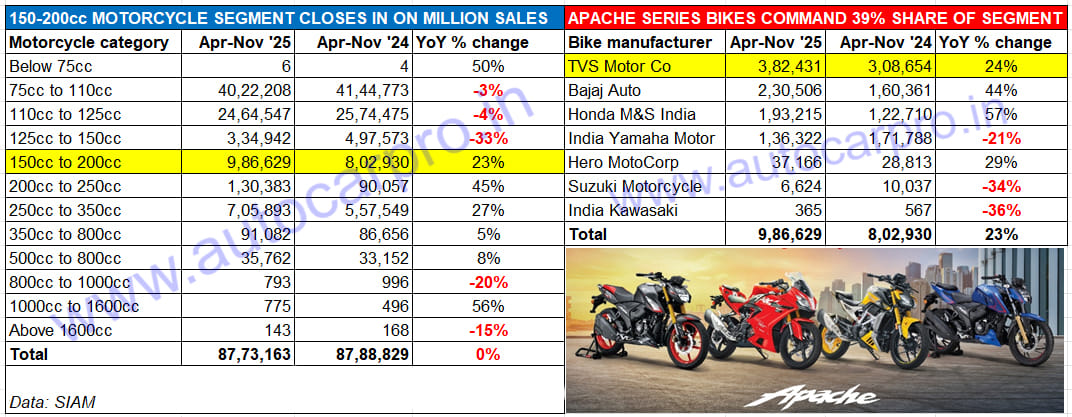 While the 150-200cc segment has posted strong 23% growth in April-November 2025, the TVS Apache commands a 39% segment share with Bajaj Auto in second place with a 23% share.