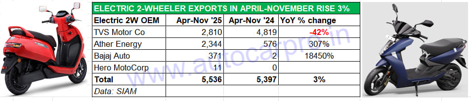 Even as the overall Indian two-wheeler industry is witnessing strong 24% YoY growth in its exports to 3.33 million units in the April–November 2025 period, the fledgling electric 2W sub-segment too is doing its bit. Export data reveals that in the past eight months of the current fiscal, a total of 5,536 e-2Ws have been shipped overseas, up 3% YoY (April–November 2024: 5,397 units). This is 81% of FY2025’s 6,845 units, with four months yet to be counted in FY2026.