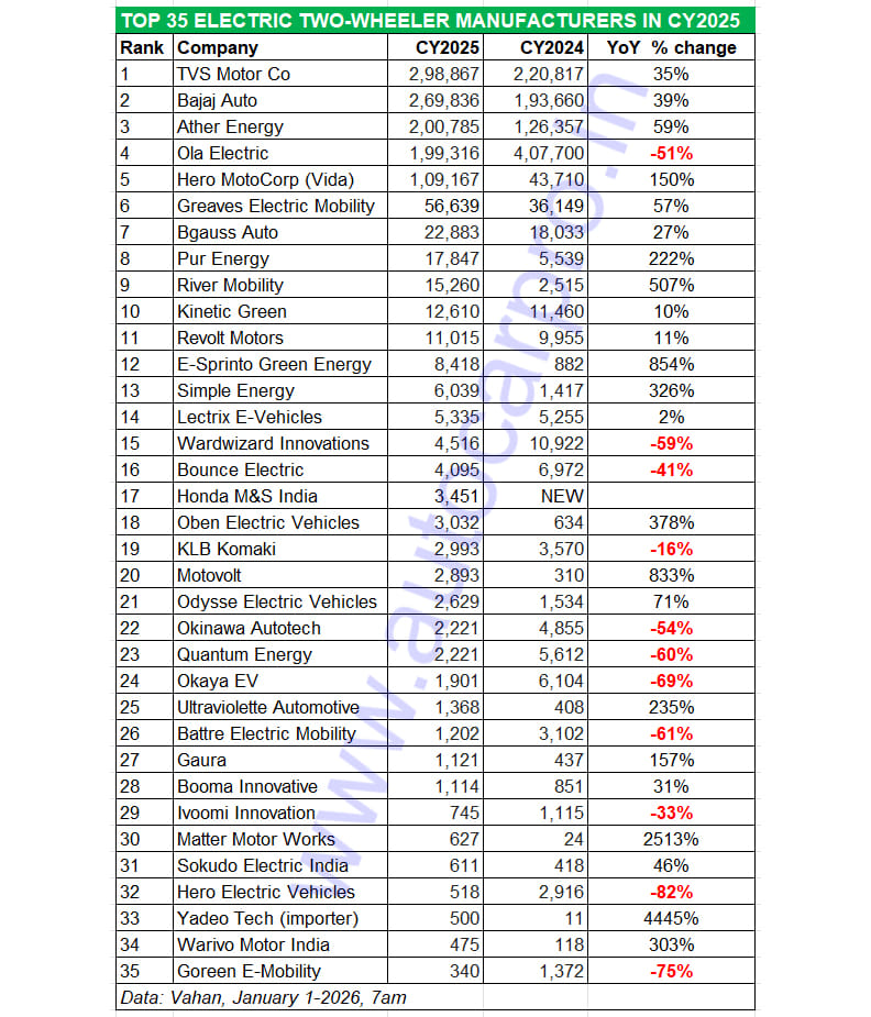 Ultraviolette Automotive, the TVS-backed e-motorcycle start-up, sold 1,368 units and is ranked No. 25 (see Top 25 e-2W OEMs in CY2025 listing below). Honda Motorcycle & Scooter India, which entered the EV market with its Activa E and QC 1 scooters, sold 3,451 units to take No. 17 position.