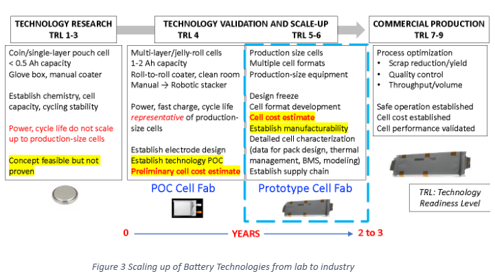This can be accomplished through a “Rapid Prototyping Centre” or a “Common Facilities Centre”. Figure below shows the steps necessary to take a cell technology concept from research level (Technology Readiness Level, TRL 1-3) to full-scale manufacturing (TRL 7-9).