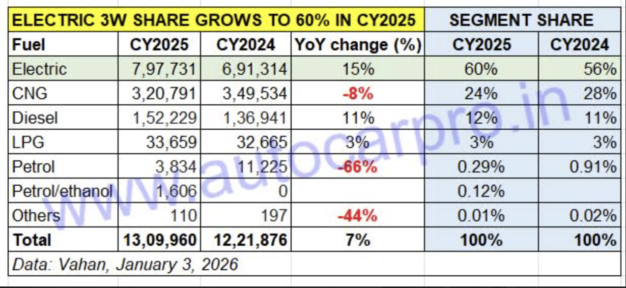 As per Vahan data, of the total 1.30 million 3Ws across all powertrains (electric, CNG, diesel, LPG and petrol) sold in India in CY2025 (see fuel-wise sales data table above), electric 3Ws accounted for the bulk of them – 60% – clearly establishing their stranglehold over this vehicle segment. Furthermore, it is also the one to register the highest YoY growth. The 15% YoY growth in sales has given it an additional 4% market share to touch 60%, increasing from the 56% it had in CY2024.