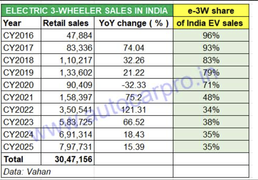 With government incentives and subsidies, electric 3W sales have risen sharply between CY2023 and CY2025, contributing 68% or 2 million of the 3.04 million units sold in the past 10 years.