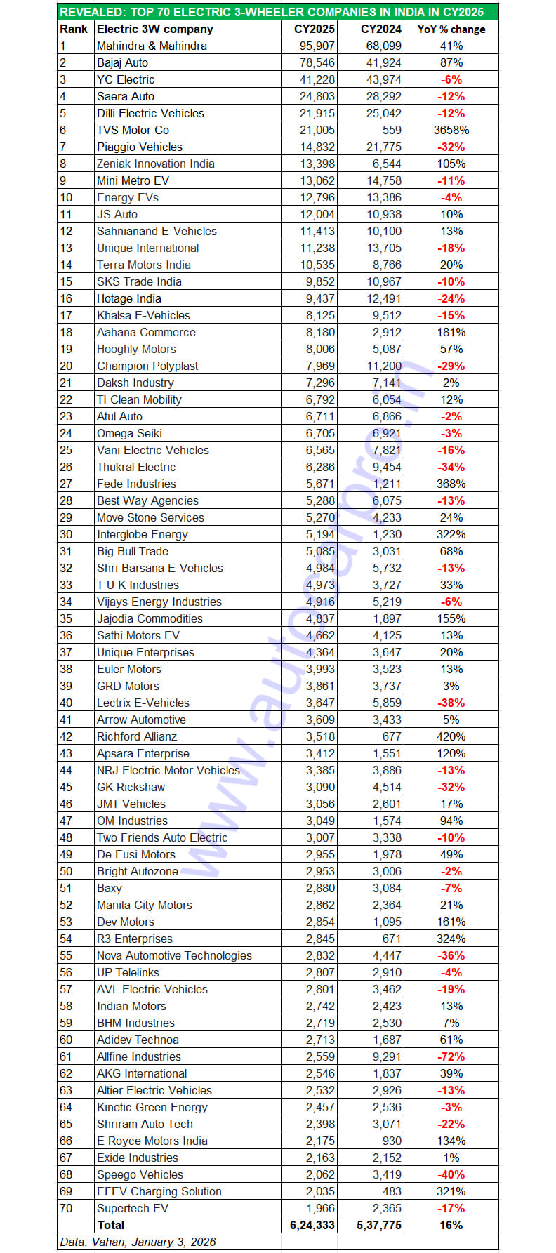 Let’s take a closer look at the top seven best-selling e-3W OEMs, who represent 1% of the 700 players in this segment in CY2025, and account for 37% (298,236 units) of the record 797,729 units sold last year.