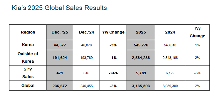 Kia Corporation reported global vehicle sales of 3,135,803 units for 2025, marking the company’s highest annual sales total and representing a 2 percent increase over 2024.