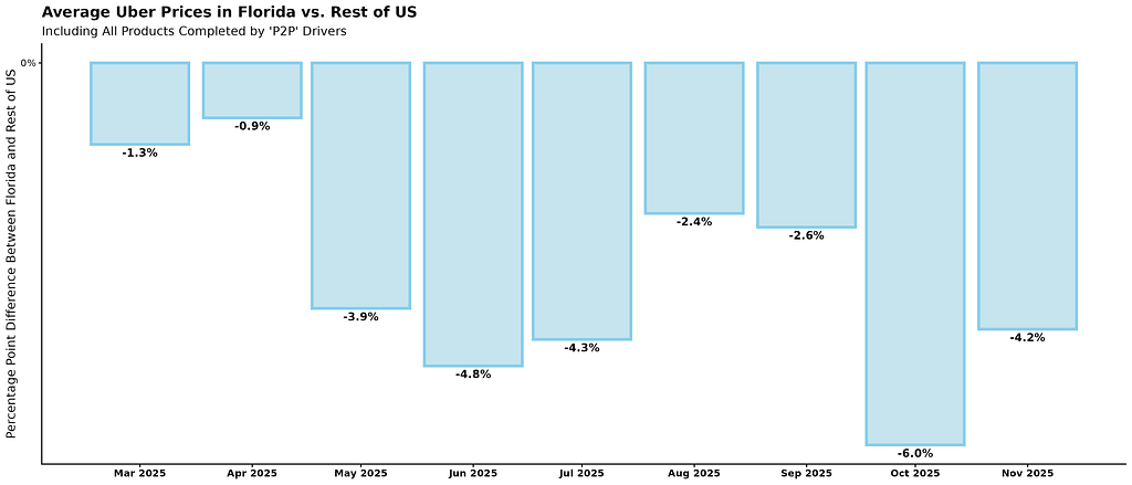 What’s more, the impacts of Florida’s reforms are even clearer when compared to the rest of the country. Since March 2025, the year-over-year change in average fares in Florida has been as much as six percentage points lower than in other states.² While Uber riders in many parts of the country have seen fares rise due to factors like excessive insurance mandates, rigid pay standards, and/or extra fees, riders in Florida are paying less.