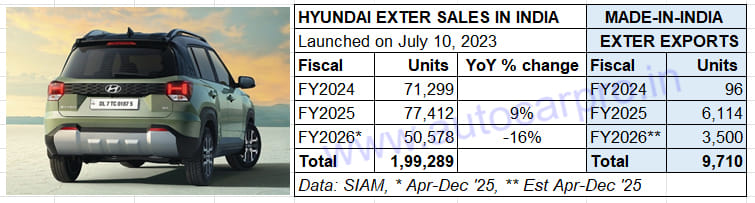 In the past 30 months since the Exter’s launch, Hyundai Motor India has sold a total of 10,08,037 SUVs. With 199,289 units (till end-December 2025), the Exter’s contribution to Hyundai SUV sales has been 20 percent. This is below its compact SUV sibling Venue’s 30% (299,532 units) and the company’s best-selling model, the Creta midsize SUV’s 46% (462,786 units).