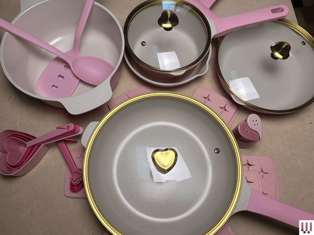 The pots and pans are very, very cute, with a glittery ceramic nonstick coating, a pink body, and gold, heart-shaped handles on the lids. The nonstick performed well. (The manufacturer recommends using low or medium heat, but I tested on high, too.) Eggs released without a trace, and melted American cheese was easy to scrape away.
