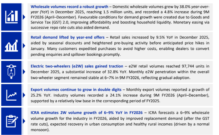 ICRA estimates domestic two-wheeler volumes to grow by 6–9% year-on-year in FY2026. The growth outlook is supported by GST rate cuts under the GST 2.0 framework, improved replacement demand after multiple years of subdued sales, recovery in urban discretionary spending and stable rural incomes, aided by a normal monsoon and continued government expenditure.