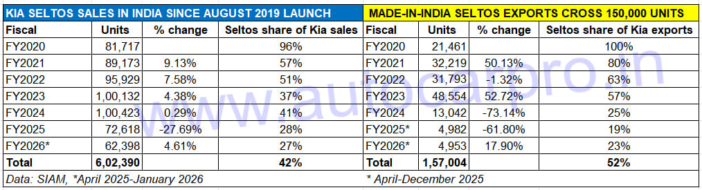 FY2024 (100,423 units) best fiscal year yet for the Seltos. New second-gen model launched in January 2026 promises to revive demand for Kia India’s best-selling SUV which has crossed 600,000 sales.
