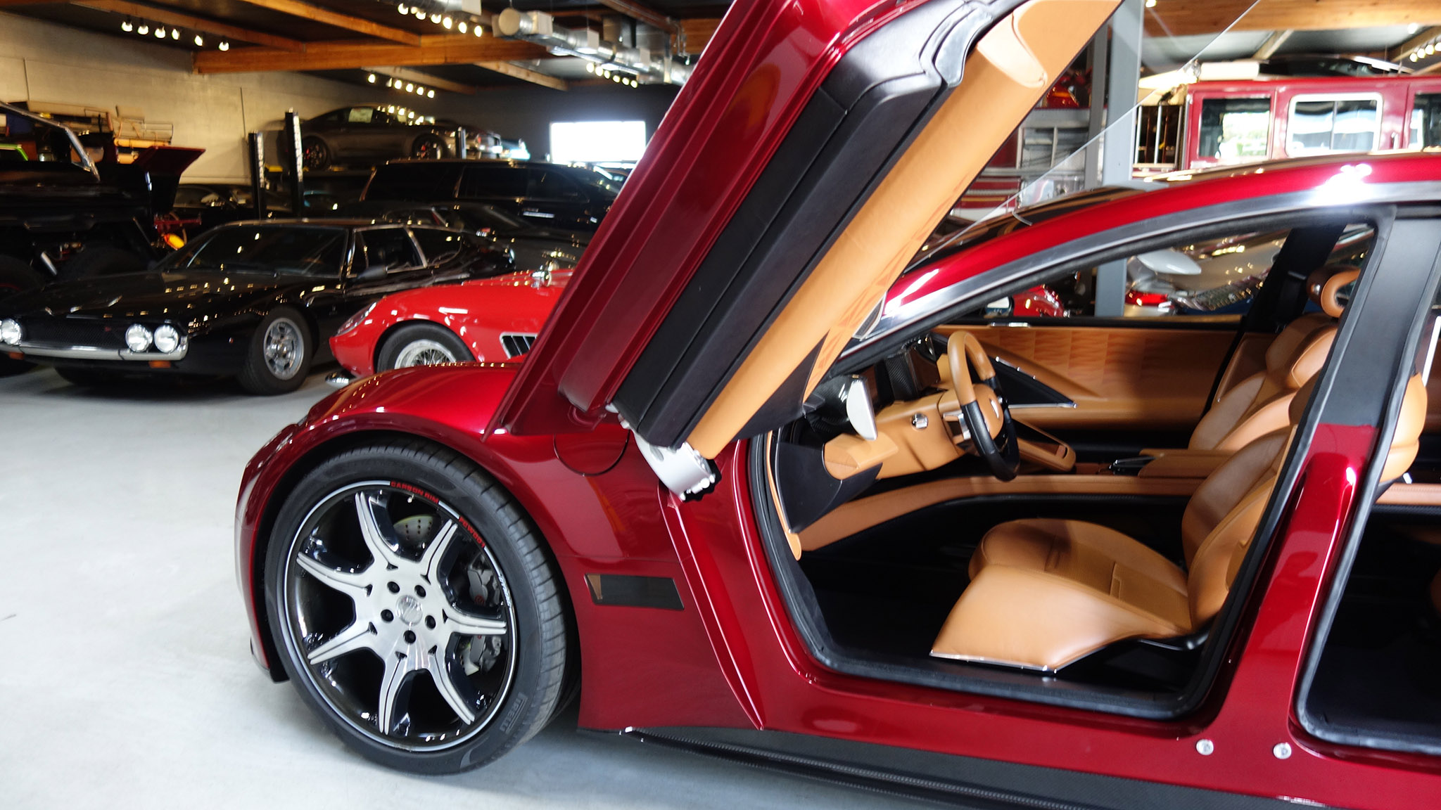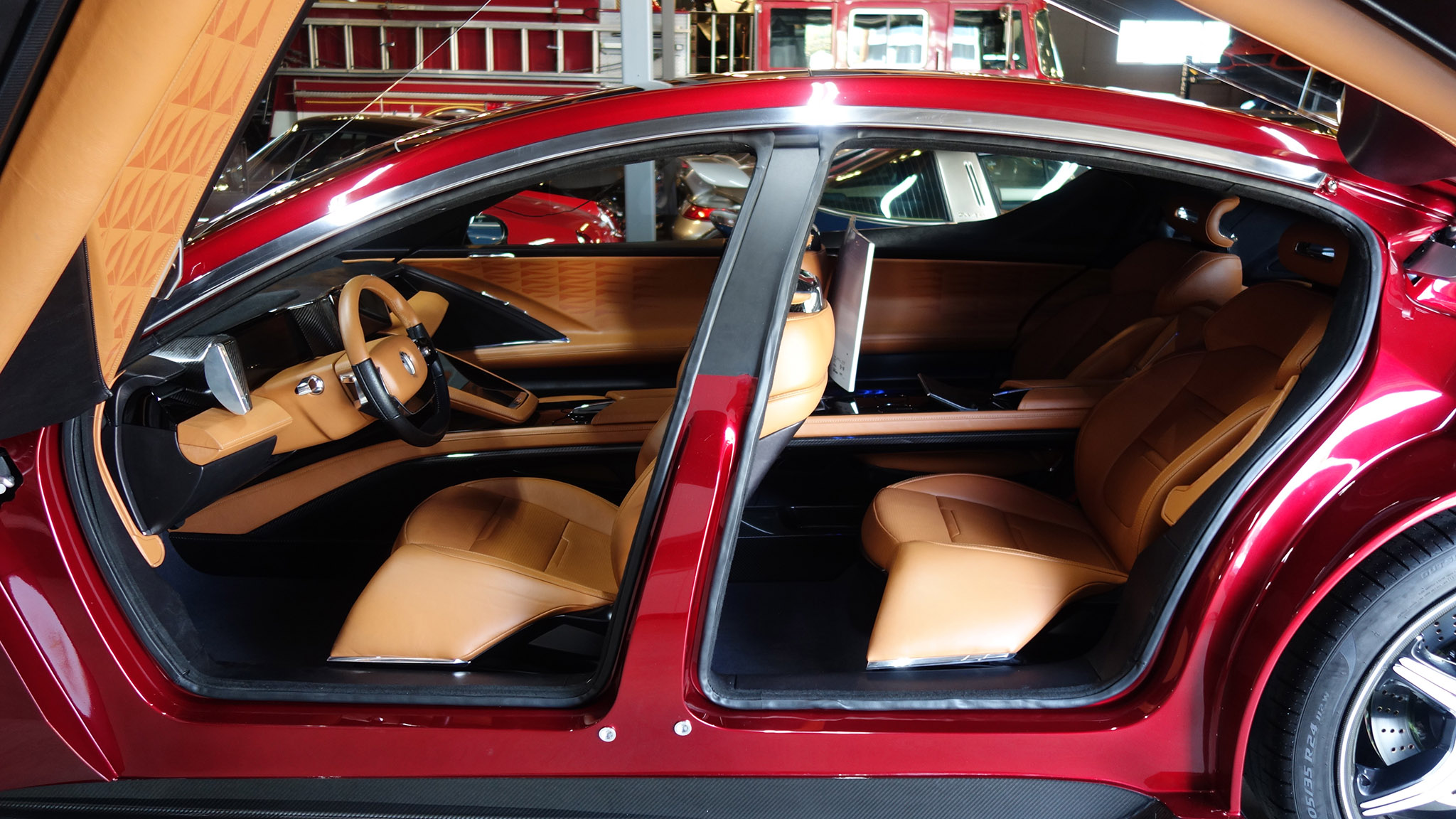 Fisker’s EMotion is one modern machine—with a splash of reflective red paint on a sculpted aluminum body, adaptive LED headlights that have give the design a feline quality, and dramatic butterfly doors. It rolls on massive 24-inch black carbon-fiber rims.