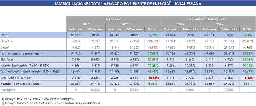 The month of January begins with an increase of 46.65% in registrations of electrified vehicles (BEV + PHEV), which represents 18.6% of the total market Electrified passenger cars open 2026 with 15,212 units sold, 48.3% more than the same period in 2025, which would increase by 55% if we discount the extra DANA sales With… Continue reading 2026 starts with 16,654 new sales of electrified vehicles