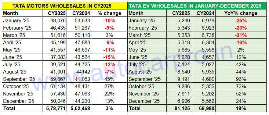 Tata Motors has closed CY2025 with its highest annual sales of passenger vehicles for the fifth year in a row, reflecting its sustained growth since CY2022. Last year, the car and SUV manufacturer dispatched 578,771 passenger vehicles, up 3% YoY (CY2024: 562,468 units). This gives the company No. 3 podium position in the PV market,… Continue reading Tata Motors Sells 578,771 Cars and SUVs in CY2025, EV Sales up 18% at 81,125 Units