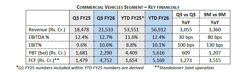 Tata Motors Limited reported a consolidated net profit of ₹705 crore for the third quarter of fiscal year 2026, compared to a loss of ₹867 crore in the previous quarter (Q2FY26). On a year-on-year basis, however, the profit declined 48% from ₹1,355 crore in Q3FY25, impacted by exceptional items totaling ₹1,647 crore related to labor… Continue reading Tata Motors Q3 Profit Down 48%; Revenue Up 17%