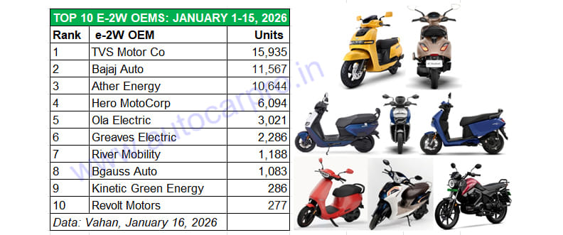 The Indian electric vehicle (EV) industry has closed the first half of the first month of CY2026 with retail sales of over 100,000 units. Between January 1 and 15, a total of 100,819 EVs across segments have been delivered to buyers across India. They are led by e-2-wheelers (55,410 units) which account for 55% of… Continue reading TVS, Bajaj, Ather, Hero Open CY2026 on a Strong Note, E-2W Sales Cross 55,000 in First-Half January