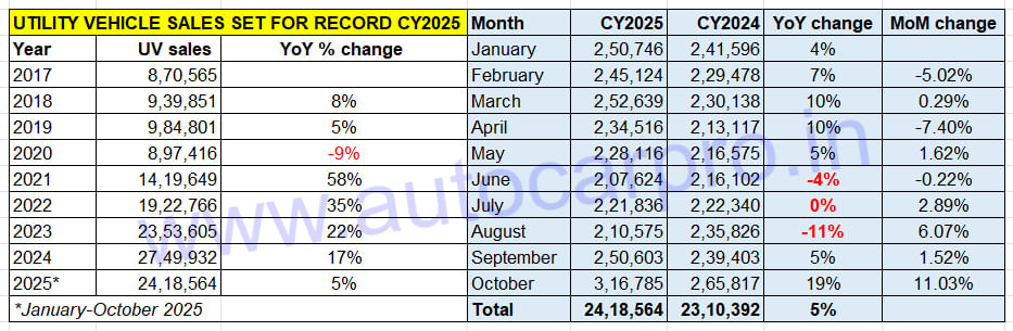India’s utility vehicle (UV) segment is firing on all cylinders and how. Driven by the festive season as well as pent-up demand and, importantly, by the GST 2.0 transition which has made most vehicles more affordable, UV wholesales hit a new monthly high of 316,785 units in October 2025, surpassing the 300,000 mark for the… Continue reading Utility Vehicle Industry Poised for Record Sales of 2.8 Million Units in CY2025