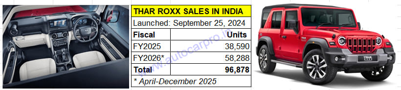 The Mahindra Thar Roxx, launched on September 25, 2024, has clocked cumulative sales of over 100,000 units in the domestic market in early January 2026. This sales milestone for the five-door avatar of the Mahindra Thar brand comes a scant 16 months after its launch. Between September 2024 and end-December 2025, a total of 96,878… Continue reading Thar Roxx Races Past 100,000 Sales In 16 Months